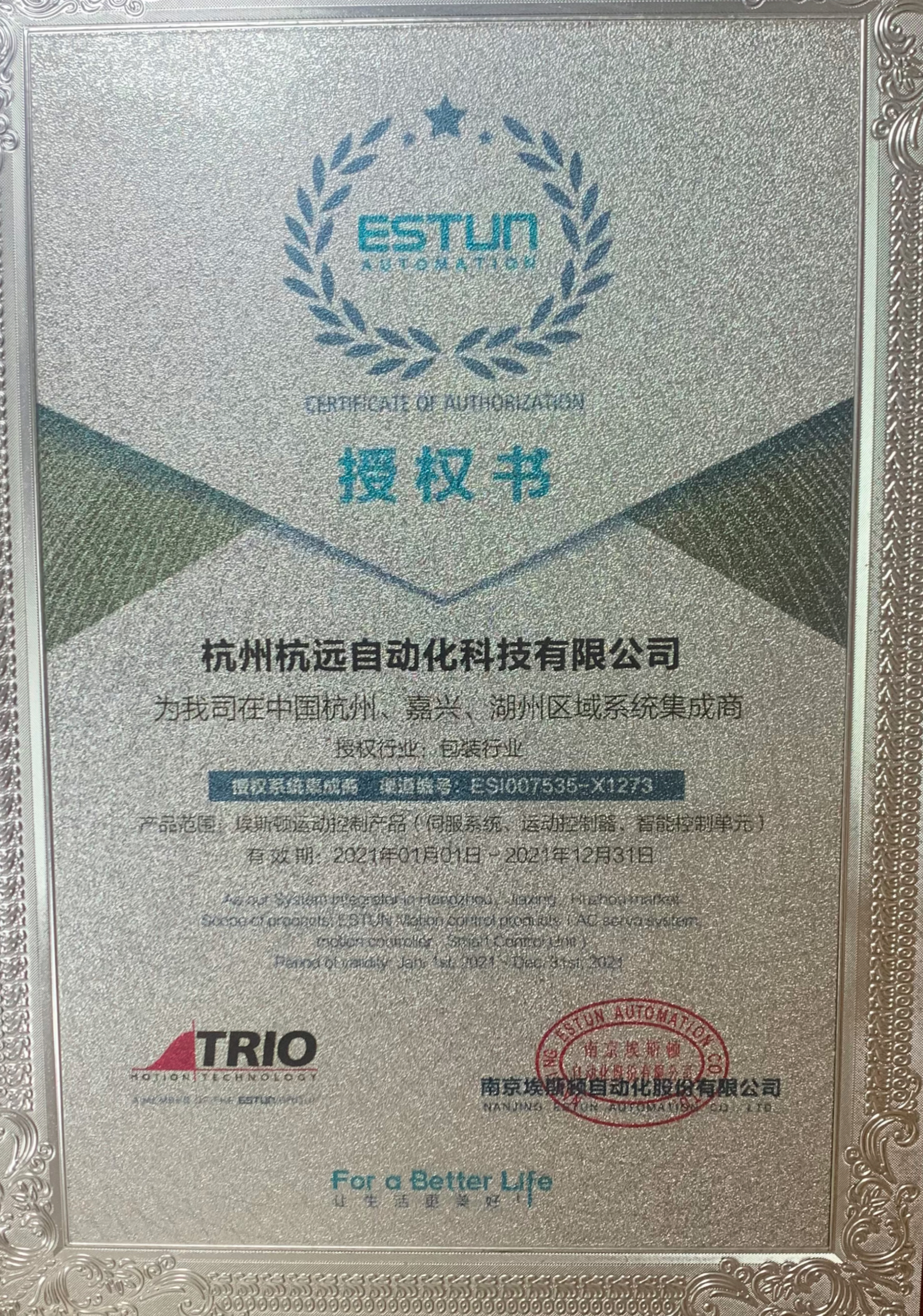 杭州杭遠自動化科技有限公司榮獲ESTUN埃斯頓品牌授權經銷商